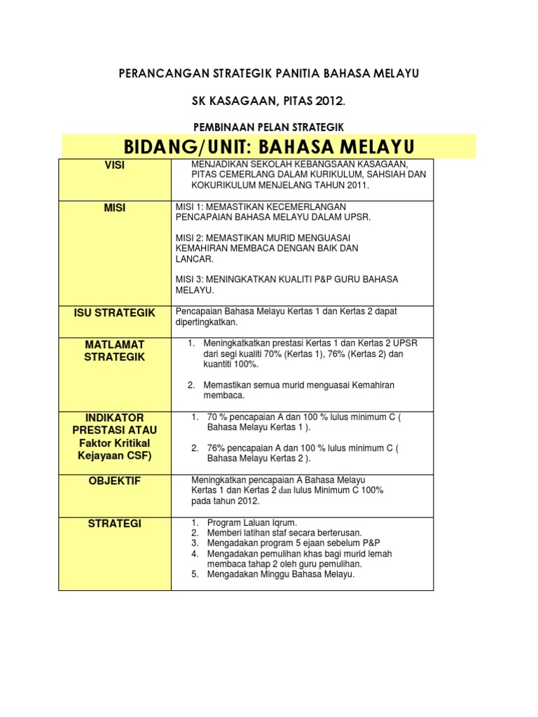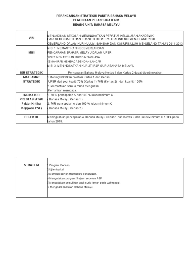 Perancangan Strategik Panitia Bahasa Melayu Pdf